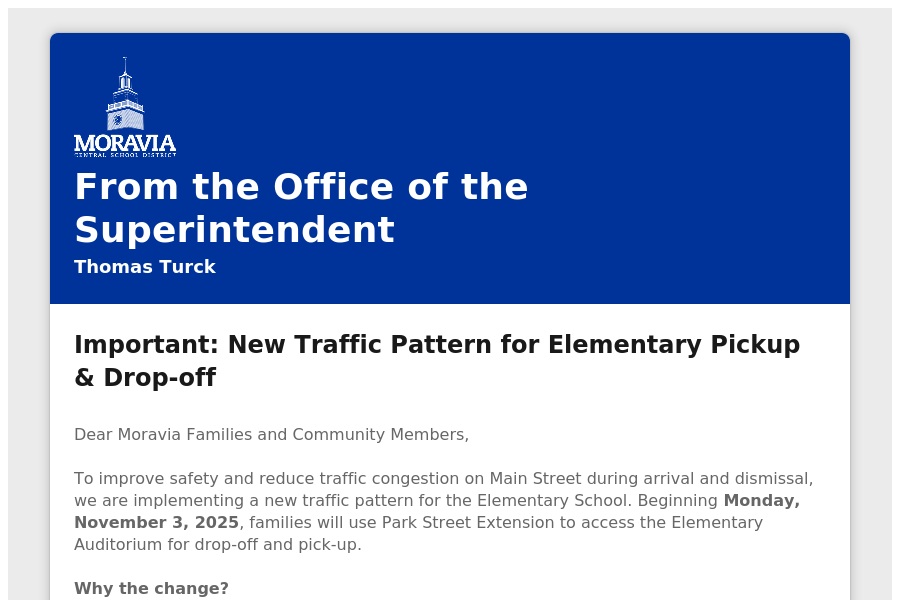 From the Office of the Superintendent Thomas Turck Important: New Traffic Pattern for Elementary Pickup & Drop-off Dear Moravia Families and Community Members, T. . .