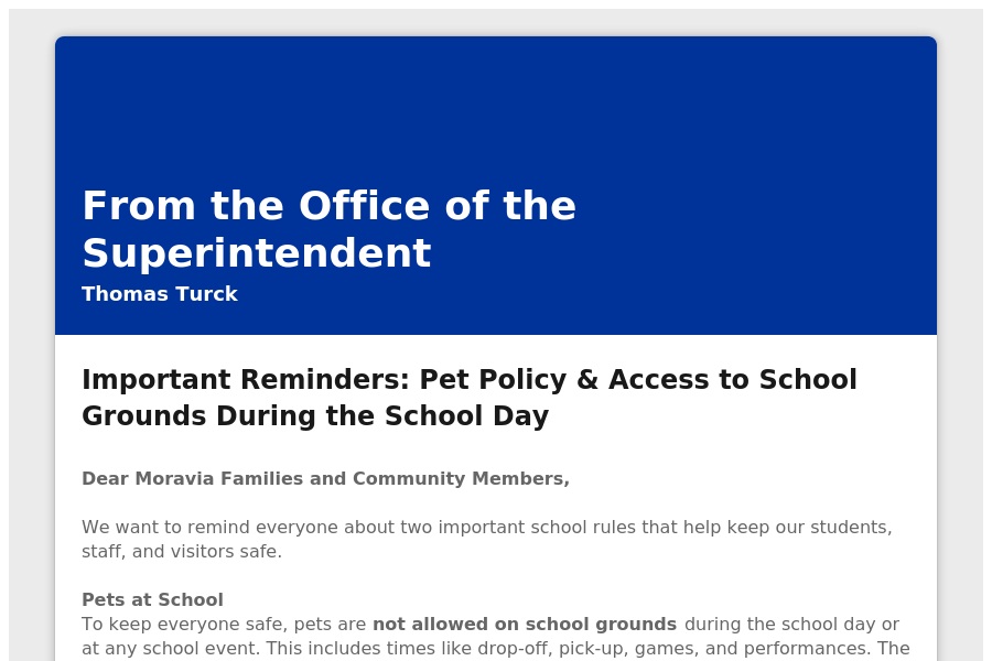 From the Office of the Superintendent Thomas Turck Important Reminders: Pet Policy & Access to School Grounds During the School Day Dear Moravia Families and Commun. . .